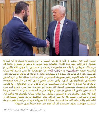 پسر! این چه ریخت و دَک و پوزی است با این ریش و پشم و آن کُت و شلوار و کراوات بهم زده ای؟! حالمان بهم خورد. یا ریش و پشم و جامه ی ترسناک چریکی یا یک «جنتلمن» درست و حسابی با چهره ای پاکیزه و آراسته چون «بنیامین» و «رَجَب تَپّه» ی خودمان! ما می دانیم که سال هاست رام و فرمانبردار شده و دستورات مان را جامه ی کردار پوشانده ای؛ همین که هم اکنون رهبر سوریه هستی را قدر بدان تا سال ها بر این کشور باستانی فرمانروایی کنی؛ ولی شاید نمی دانی که در «ایالات متحده» پرتوری که مردم و حتا برخی سیاست بازان گاگول تر از خودمان از تو دارند، همان تروریست پیشینی است که چون آبِ خوردن سر می بُرَّد و آدم می کشد؛ می دانی که بیش تر مردم جهان خِرَدشان به چشم شان است و ما هم که نمی توانیم ریز و شپشِ زندگی ترا برای شان بگوییم که پیامدِ آن، تَف و ناسزایی است که به سر وروی مان خواهند بارید؛ شمارِ بسیاری از آنان هم رای دهندگان ما هستند. بماند که پیروان خودت در اینجا هم سر به نیستت خواهند نمود. نشنیده ای که هم خر، هم خرما نمی شود؟